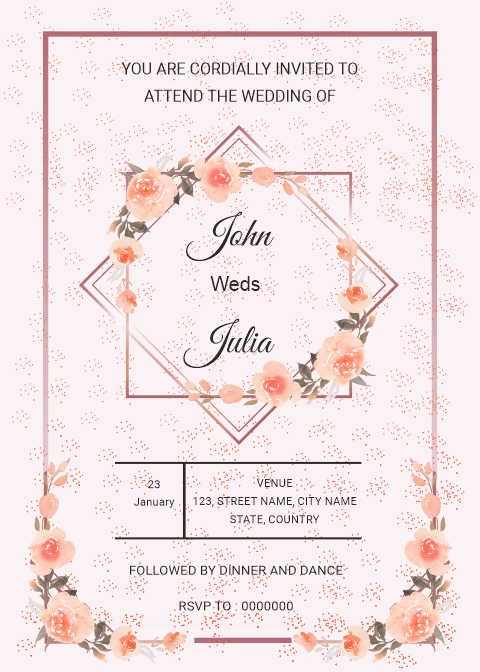 Fully editable, downloadable wedding invitation PDF or whatsapp card design.