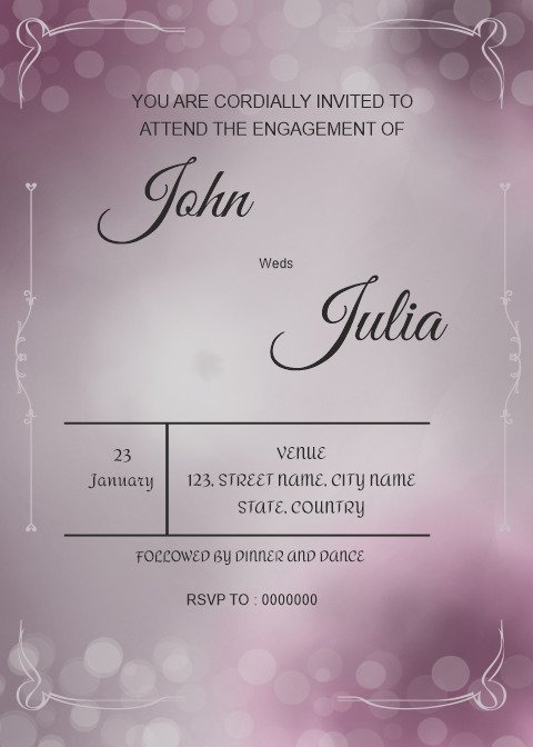 Create online engagement invitation using this card template, special out of focus round effect background, brush effect and vector arts decoration.