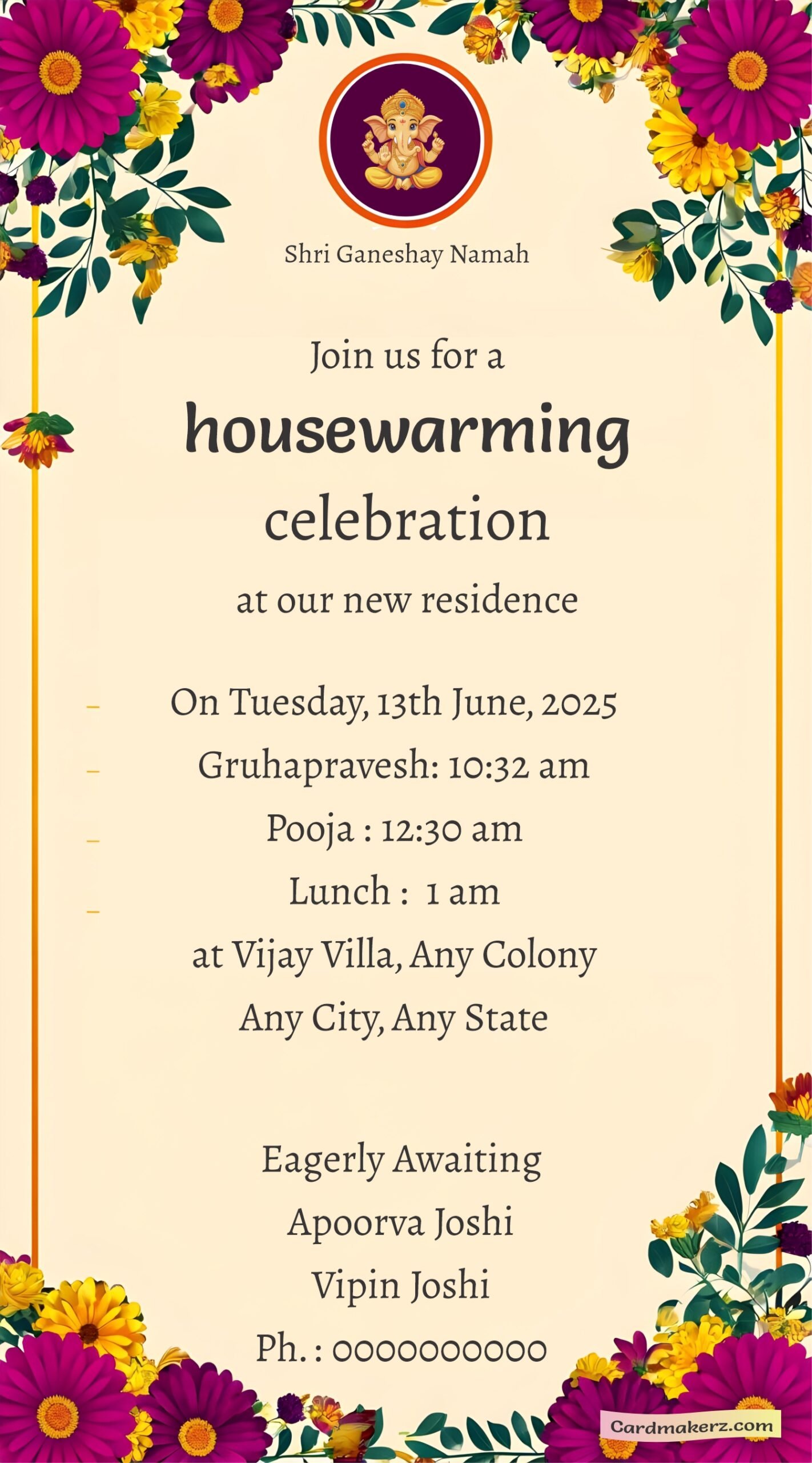 Celebrate your new beginnings with a beautiful Gruh Pravesh evite that sets the tone for your special occasion. Our floral boom template allows you to craft a unique invitation tailored to your taste.