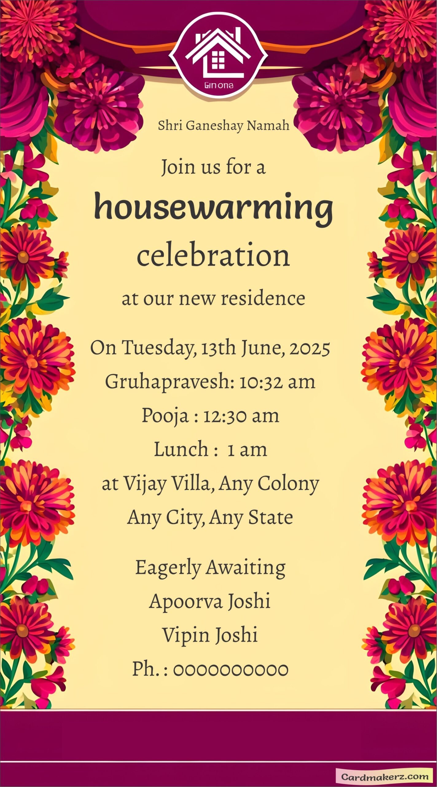 Welcome to the easiest way to create your online gruh pravesh invitation card, Our platform offers a free design feature where you can customize every detail, making your invitation unique and personal.