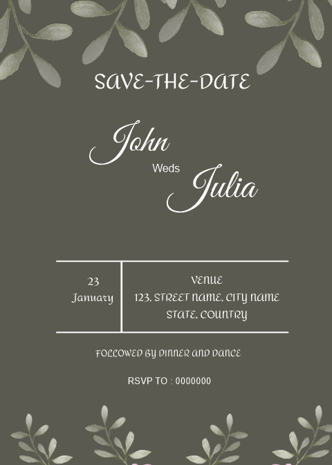 Create your Save The Date Card online with this beautiful yet sober card template, hanging leaves decoration and green background makes this card design stunning.