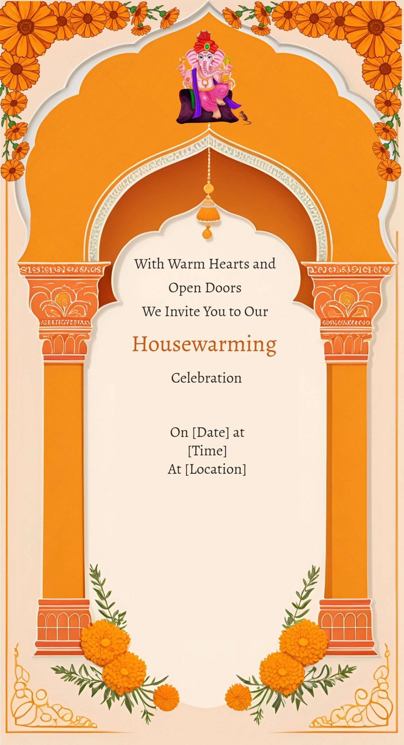 Invite your loved ones to your housewarming celebration with our beautifully designed Indian-themed invitation card. Featuring vibrant marigold flowers and an elegant arch of a decorated house, this fully editable online invitation allows you to customize all the details effortlessly. Perfect for capturing the spirit of warmth and hospitality, this invitation sets the tone for a joyful gathering. Celebrate your new beginnings in style with a touch of traditional charm.