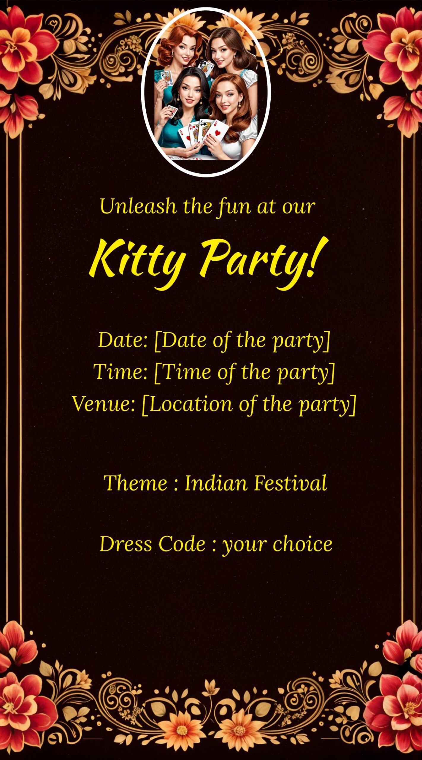 Are you planning a kitty party and need the perfect invitation? Look no further, Our black floral pattern kitty party invitation template is designed to impress your guests. The elegant and chic design encapsulates the essence of fun gatherings, making it an ideal choice for any kitty-themed event.