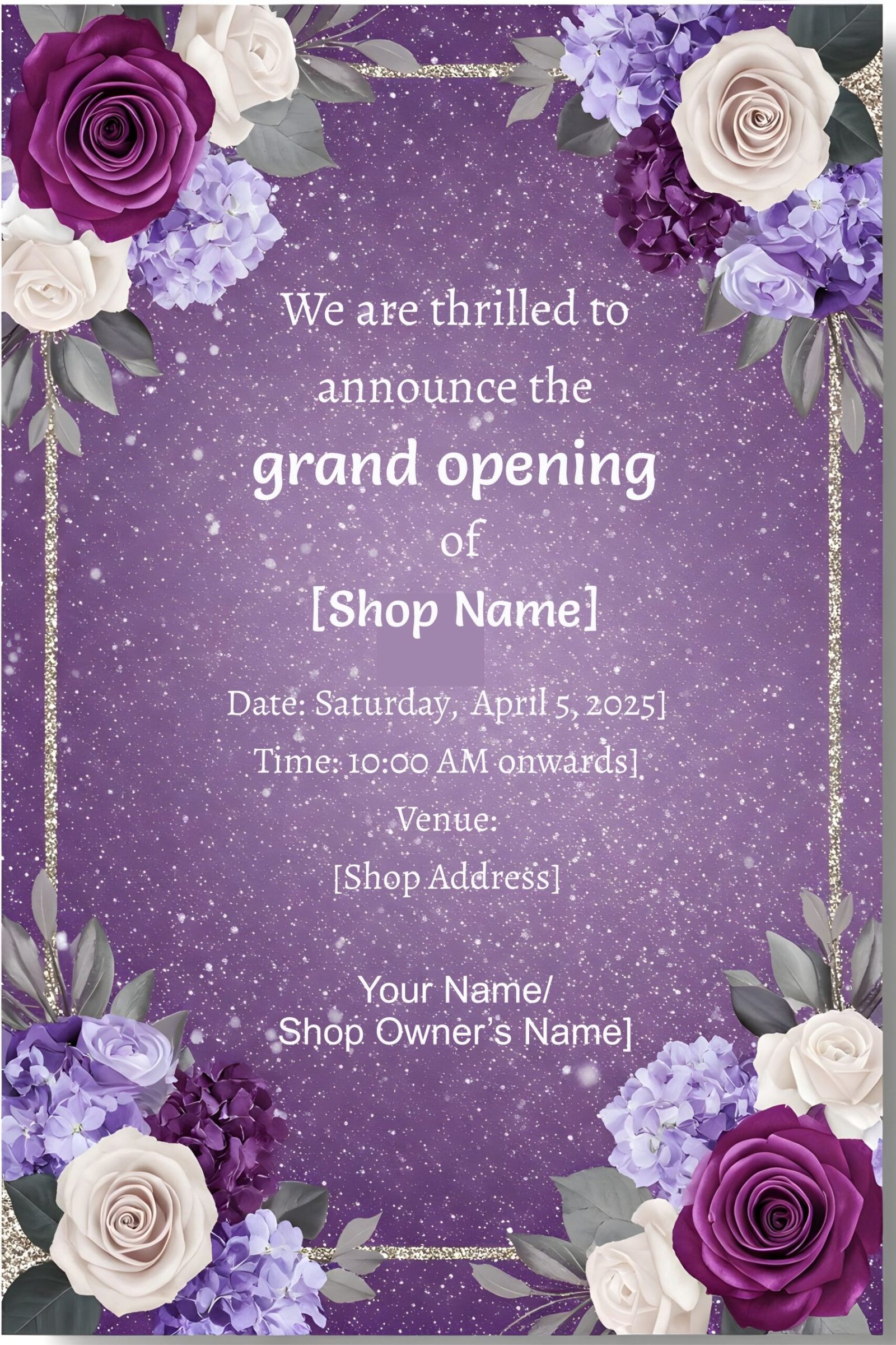 Make your big day pop with our Purple Mania Opening Ceremony Invitation Card, This stunning design blends elegant purple hues with delicate floral accents, perfect for announcing your grand opening in style. Whether it’s a shop, office, or any special venture, this card sets the tone for a celebration that’s unforgettable.