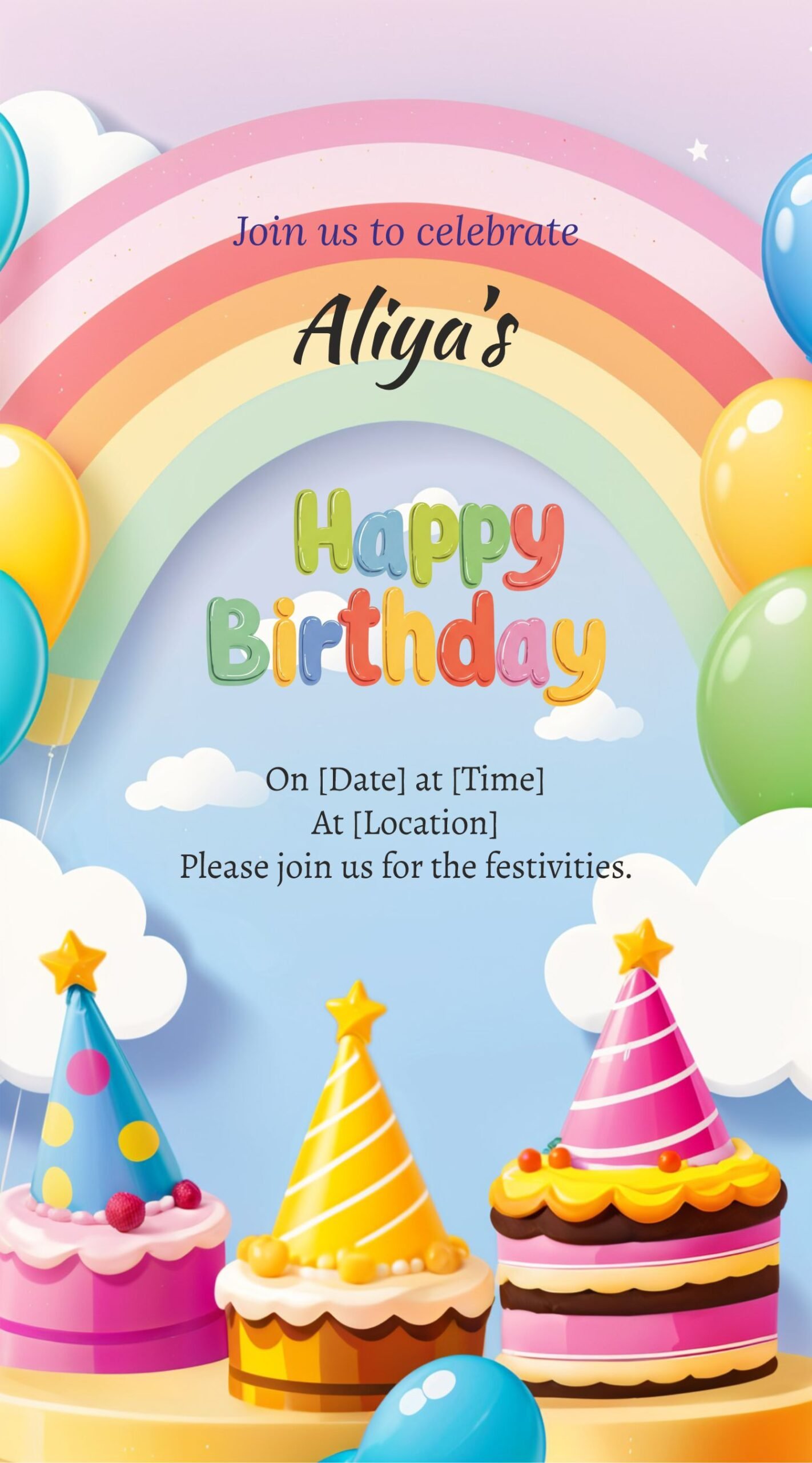 Once you’ve finished designing, download your beautiful birthday party invitation for free! Share it digitally or print it out – the choice is yours. Make your rainbow-themed birthday celebration unforgettable with our vibrant invitations.