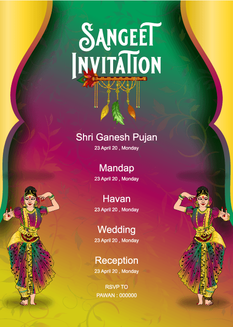 Introducing our dark rainbow wedding invitation card, colorful indian themed card design with welcome idol clipart on both side. beautifully crafted wedding evite, create your invitation online with our card maker app.