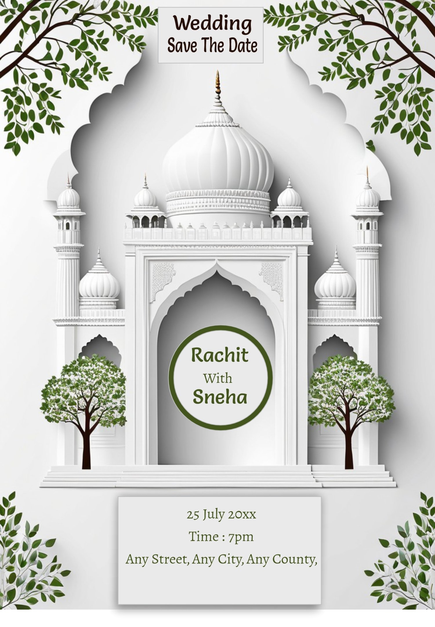 Make your special moment unforgettable with our adorable Save the Date invitation. Featuring a stunning and unique white Taj Mahal in the background, this design will captivate your guests right from the start.