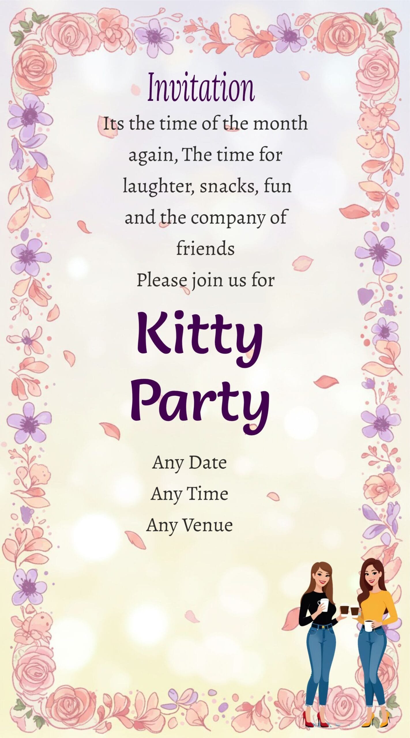 Invite your friends to an unforgettable kitty party with our Unique New Theme Kitty Party Card. Tailored for creative hosts, this card offers free online editing, enabling you to customize every detail. Add your personal touch to the invitation, showcasing the theme of your gathering and making it the highlight of your social calendar.